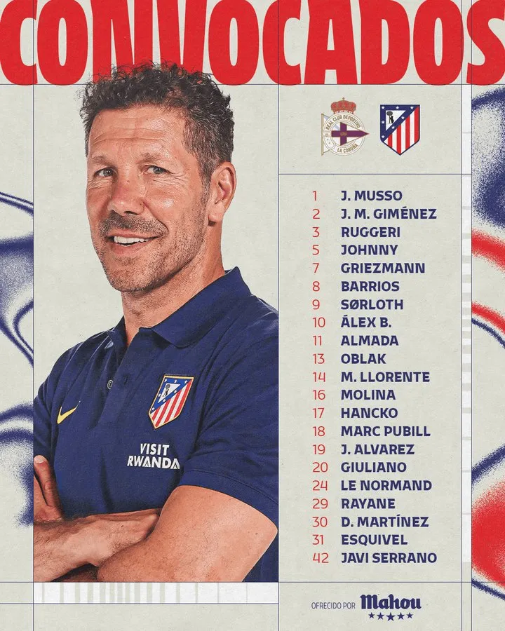 虎扑01月13日讯 北京时间明天凌晨四点,马德里竞技将在国王杯中做客挑战拉科鲁尼亚。赛前,马竞官方公布了本场比赛的大名单。